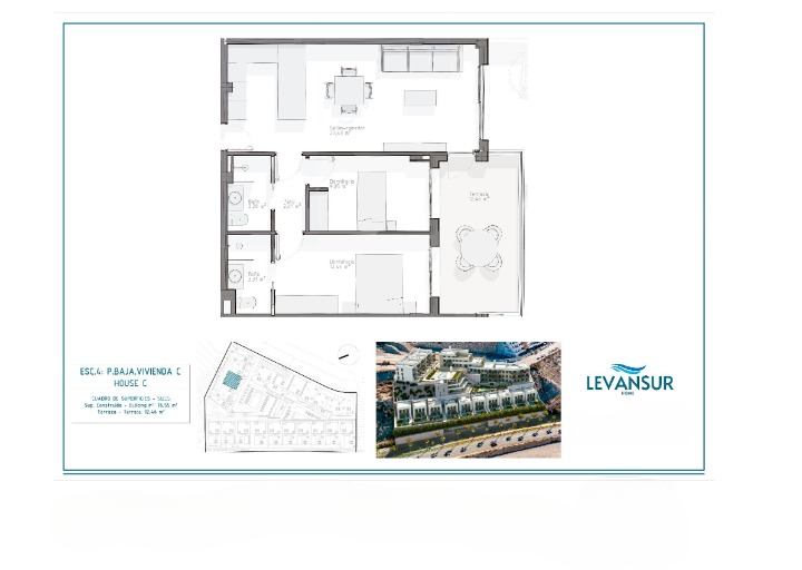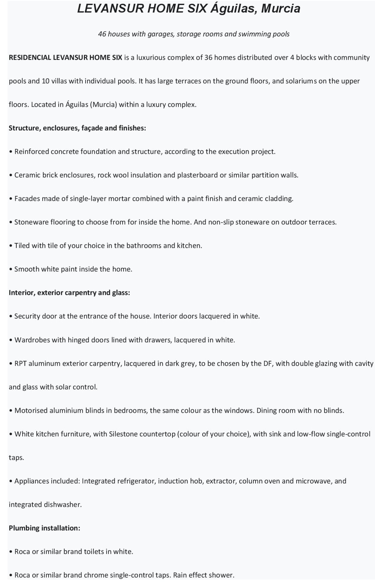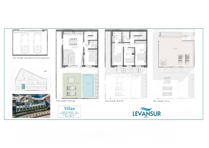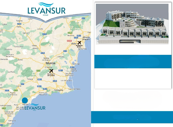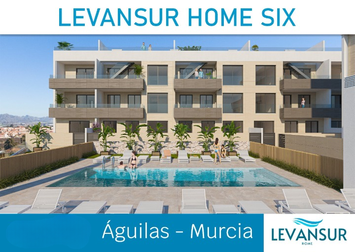 Levansur Home SIX– ÁGUILAS has 36 apartments with 3/2 bedrooms and 2 bathrooms distributed in 4 modern blocks, equipped with 2 community swimming pools, community garage with parking space, and storage room for each property. Spacious terraces on the ground and first floor and Solarium with Summer kitchen on the upper floor, to enjoy all hours of sunshine every day of the year. It also has 10 elegant villas of 4 bedrooms and 3 bathrooms with private swimming pool.