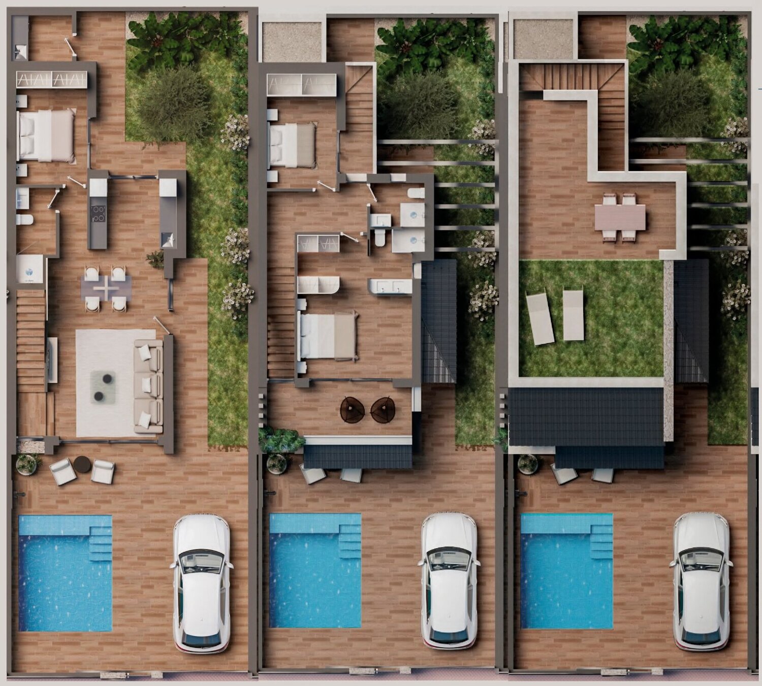 Each villa has 3 bedrooms and 3 fitted bathrooms. Designed on three levels with a contemporary style and open planned concept, comprising a fully-fitted kitchen and lounge-dining room.