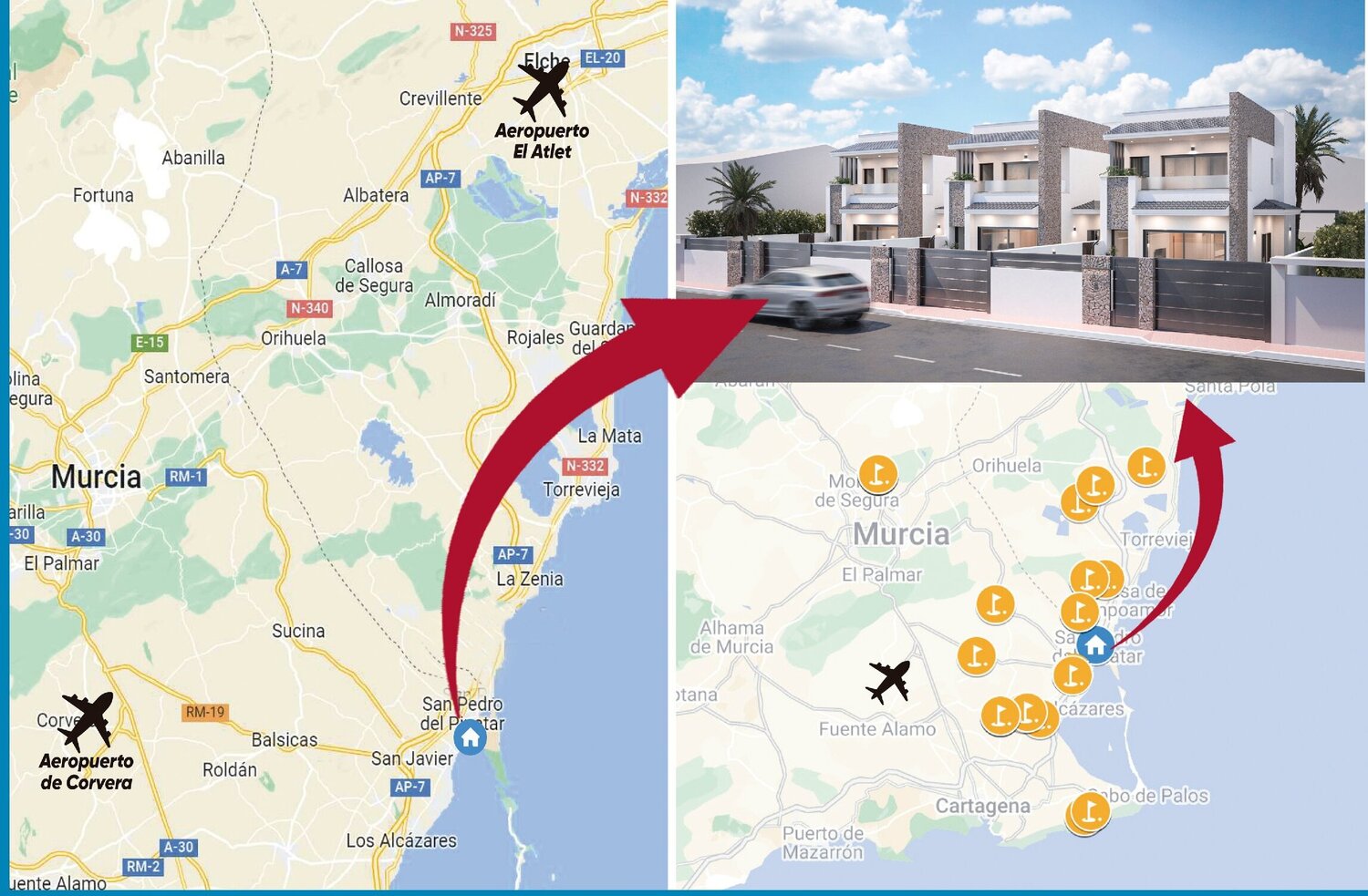 The development is located in San Pedro del Pinatar (Murcia), 1,5 km far to the beach, surrounded by services, parks, sports facilities, several Golf Courses.