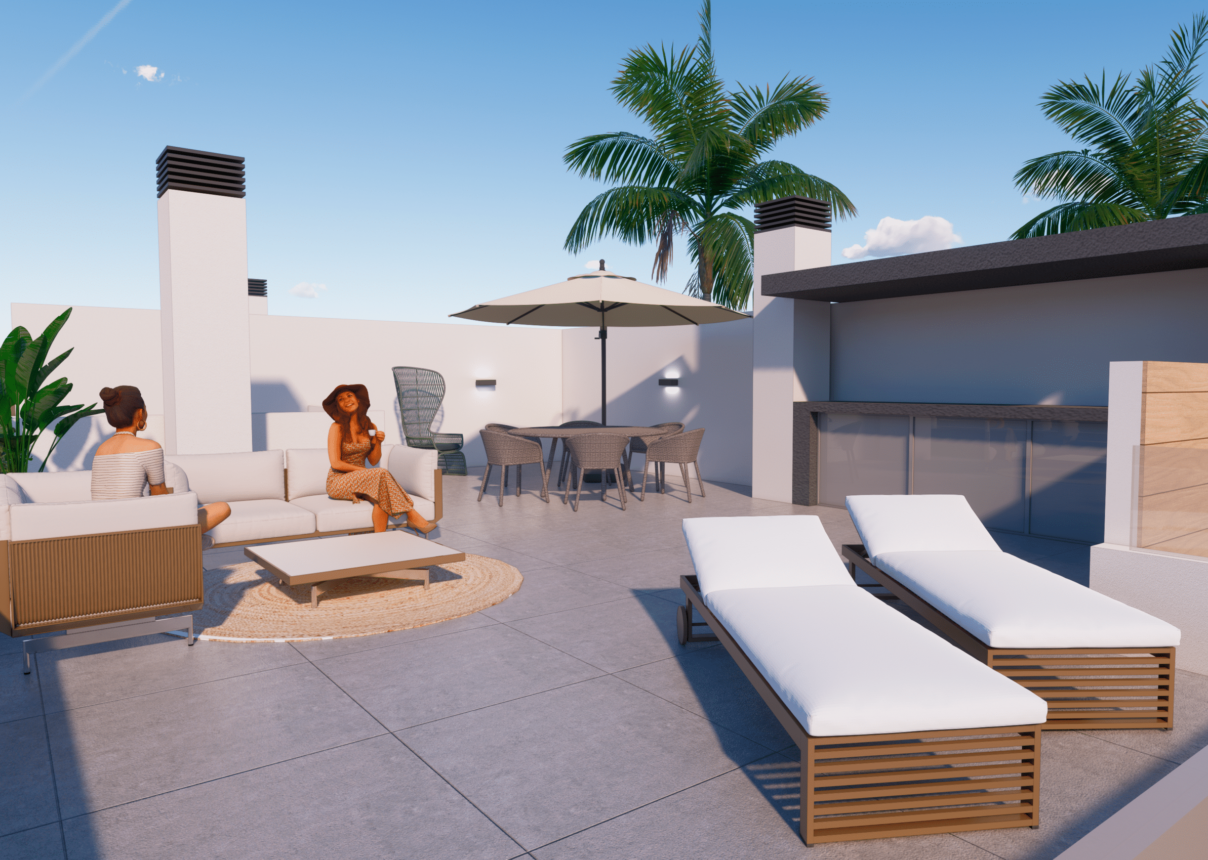 - Summer kitchen in solarium terrace, with sink and pre-installation for washing machine and mini-fridge. Tiling with thermal insulation, waterproofing with asphalt cloth and ceramic stoneware finish. Metal staircase for access from the outside.