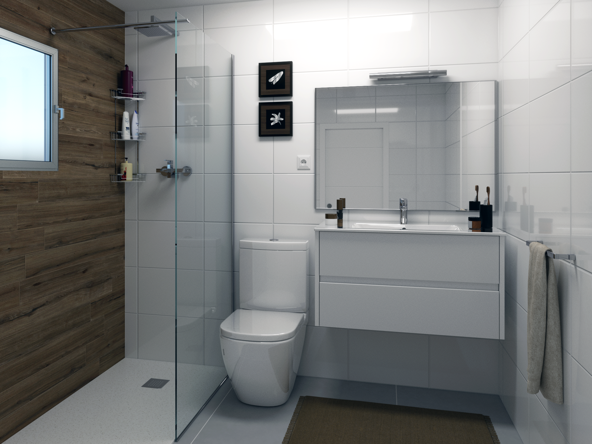 • Stoneware flooring throughout the house with 60×60 format, including terraces. Different formats and choices. Bathrooms tiled in white with choice for shower area. Bathroom vanity unit, mirror and light above the washbasin included.